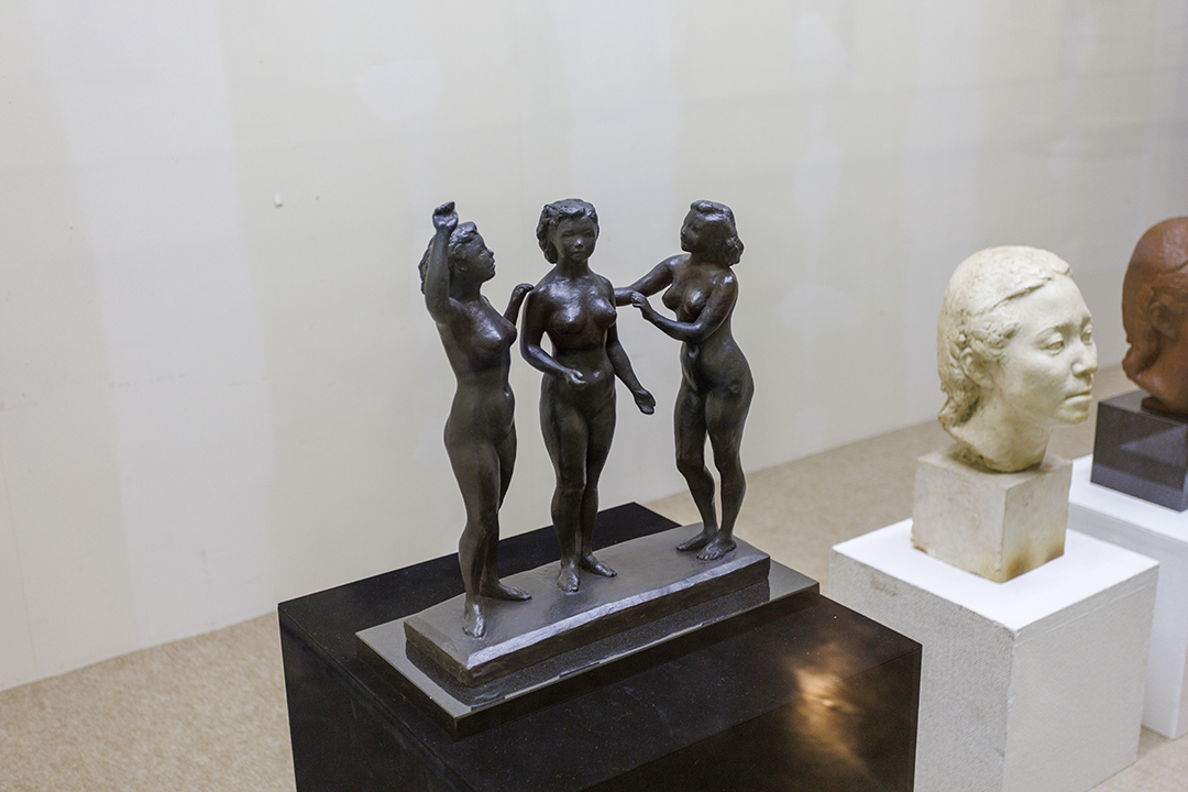市収蔵の契月の掛軸や新たにブロンズ化した一雄の彫刻「平和の群像(試作)」などを中心に展示しています。
